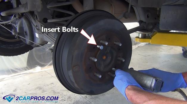 Первый способ снять тормозной барабан - это вставить два болта, которые обычно имеют размер 8 мм x1.25, а затем равномерно затяните их, чтобы барабан вытолкнулся наружу и его можно было снять.