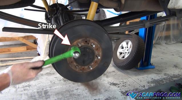 Второй способ - использовать, если нет отверстий для болтов или если у вас их нет. есть болты. Используйте молоток и ударьте по барабану между шпильками. это будет "толкать" барабан с фланца оси. Соблюдайте осторожность при использовании молотком, чтобы не задеть шпильки колеса. Это лучший способ удалить застрявший тормозной барабан.